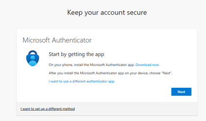 At this stage you need to select a second level of authentication which you will use every time you sign in. If you don’t already have an authenticator app installed on your phone, then we recommend using the first method, (receive a code to your mobile phone).