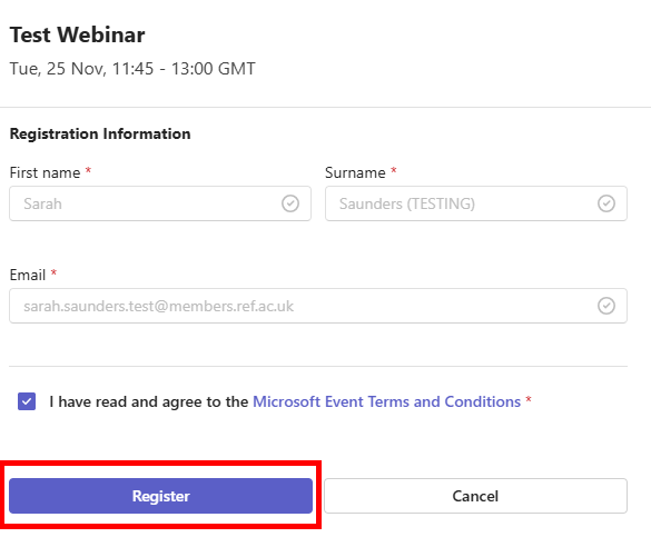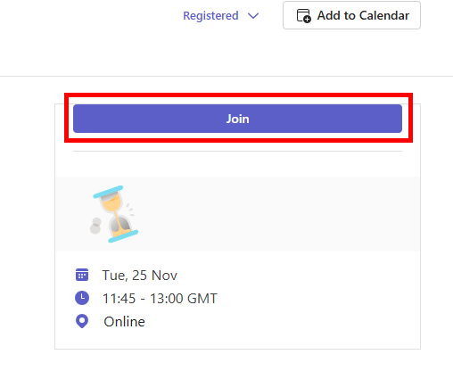 Some Teams meetings in the REF Hub will run as webinars. These need to be registered for in order to gain access, and the process for joining them is slightly different from a usual Teams meeting.